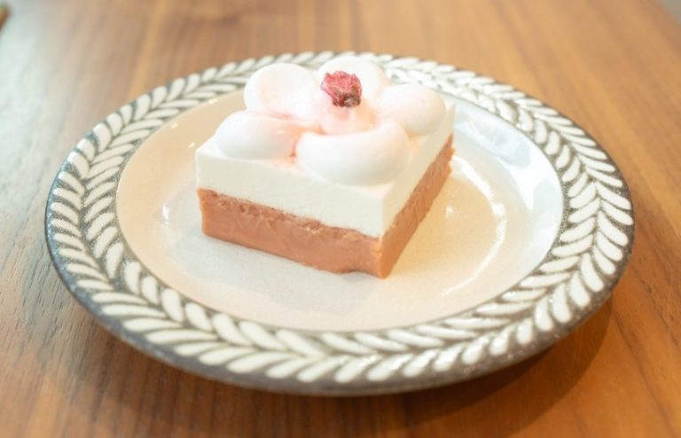 ペースト状の塩漬けした桜の花と葉を練り込んだホワイトチョコレートを焼き上げた層の上に、クリームチーズのムースが重なっています。