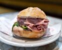 テイクアウトする人もいる「パニーノ」(900円)は、ローマの定番・ロゼッタパンにモルタデッラハム、クリームチーズ、ルッコラを挟んだシンプルなサンドイッチ。