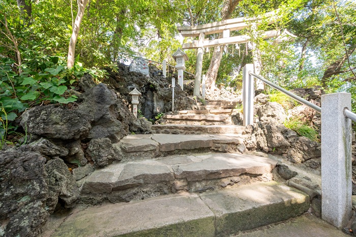 鳥居をくぐり、石段を登るとその両脇には荒々しい岩肌が続きます。