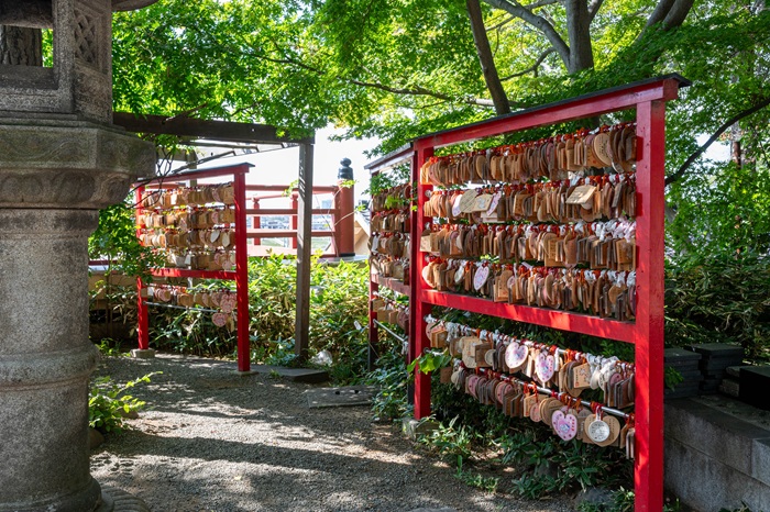 3路線の列車の音が絶え間なく響く、スリリングな立地。それでも境内に一歩足を踏み入れると、喧騒は遠くに置き去りにされたかのように、時の流れがゆるやかに戻されます。