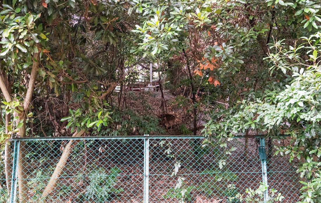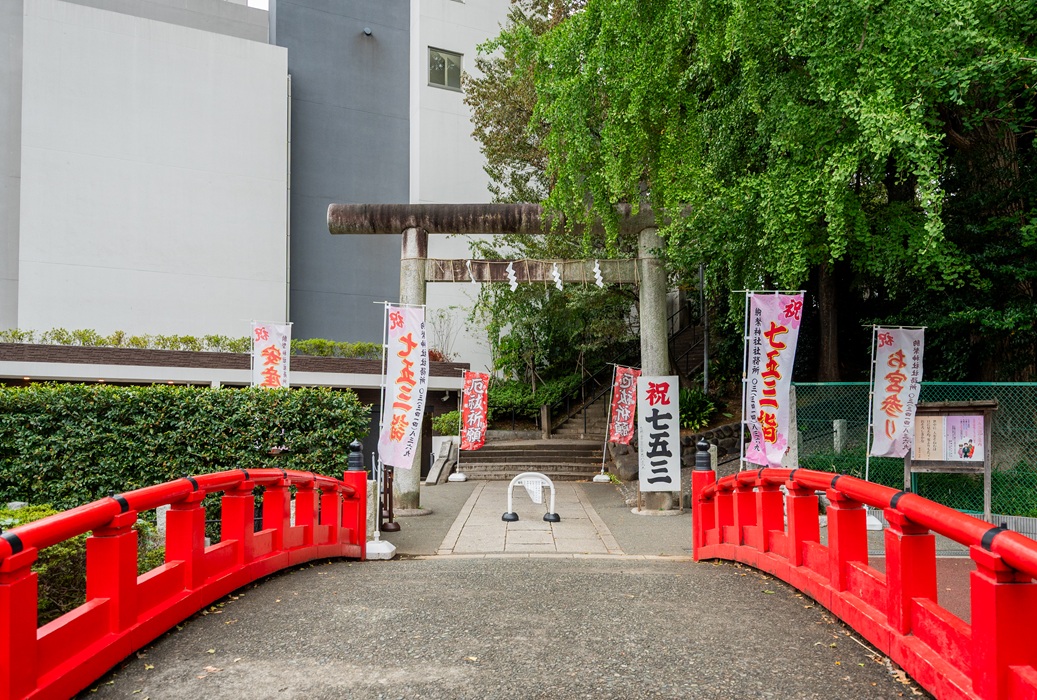 道の真ん中にひっそりと建つ葦毛塚から、かつて蛇崩川(じゃくずれがわ)が流れていた道筋をたどっていくと、「駒繋(こまつなぎ)神社」に行き着きます。頼朝が馬をつないだと伝えられることからその名がついた神社。樹木に包まれた高台に設けられた境内はこぢんまりとしていながらも、穏やかな空気に包まれています。