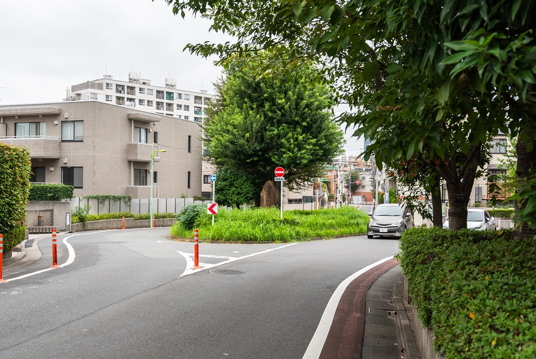 目黒区と世田谷区の境目にある住宅街を抜けると、道路の中央部に忽然とこんもりとした小さな塚が姿を現します。初めてこの光景を目にした人は一瞬「一体あれは何?」と首をかしげることでしょう。