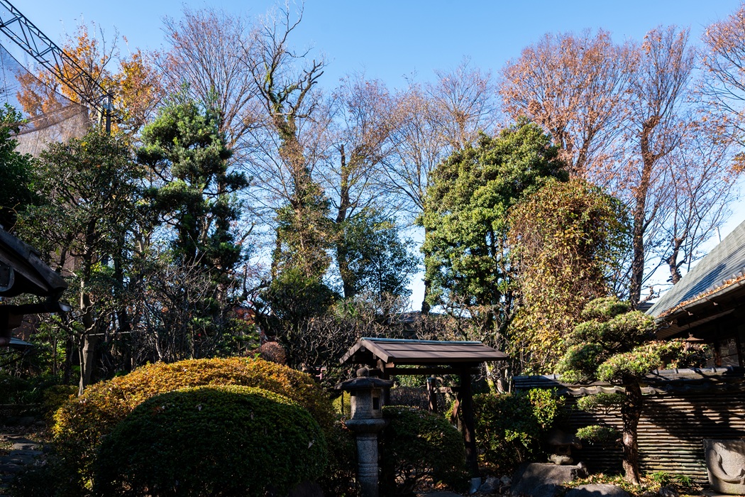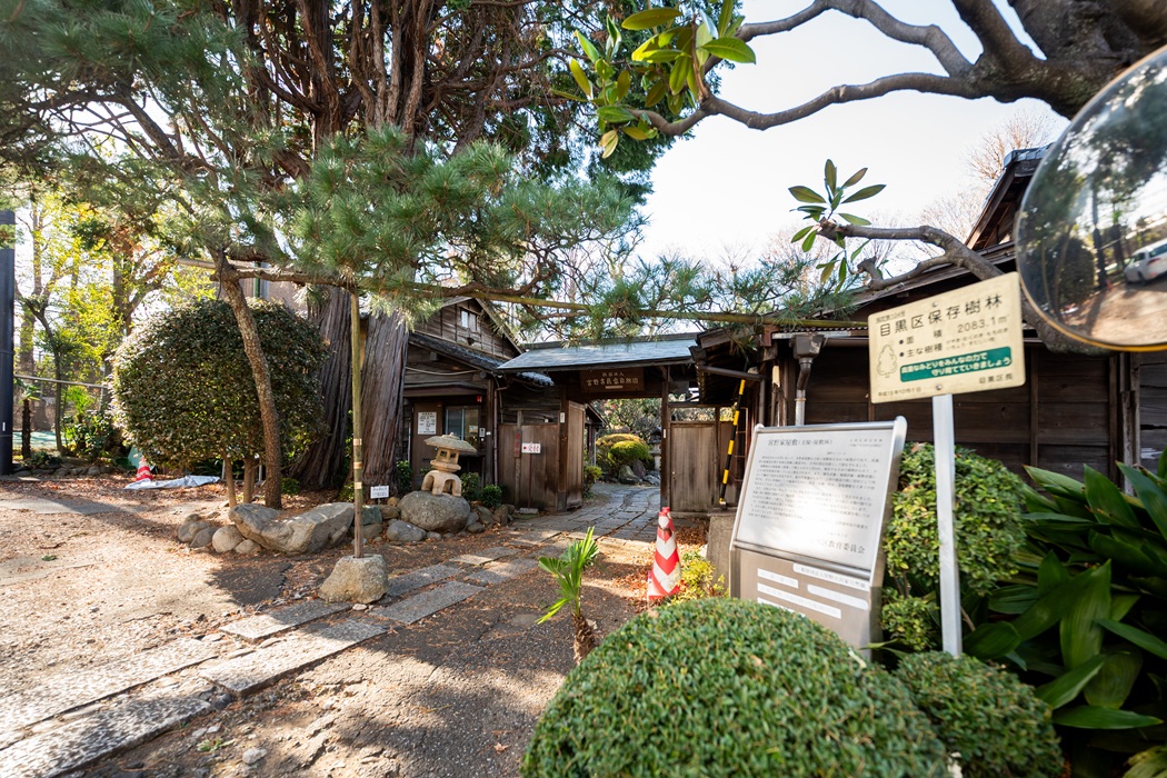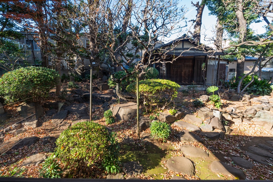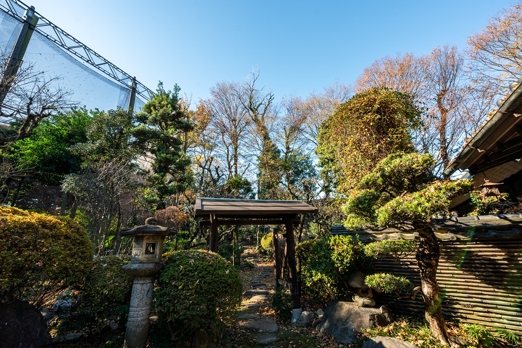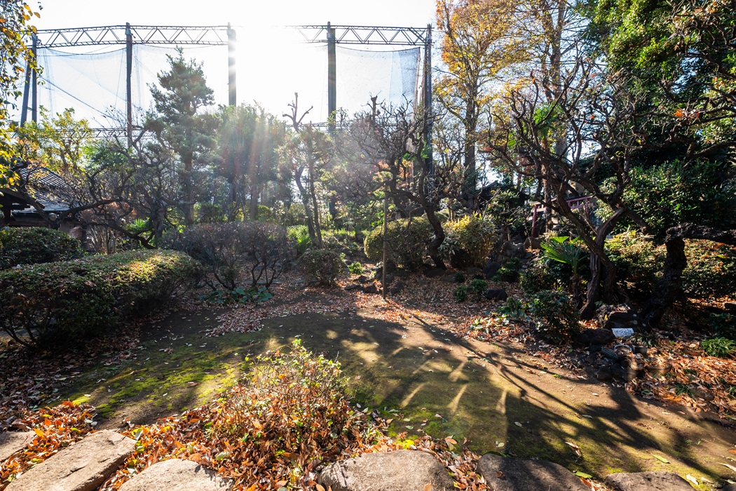 冬枯れの木立もまた味わい深く、武蔵野の面影を今に伝える屋敷林には、20mを超える樹木も30本以上を数えます。茶室の傍らにそびえる推定樹齢250年超のケヤキや、高さ27mに及ぶ雄松といった巨木はこの地を見守ってきた存在。