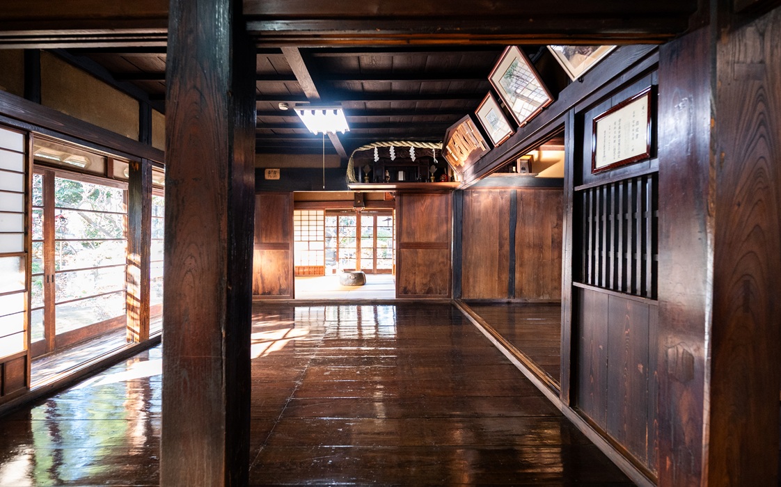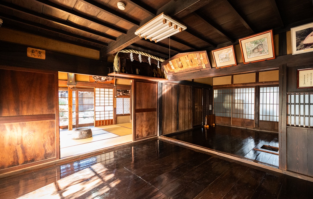 約3.5mの重厚な上り框に接し、家の中心ともいえる居間は「ザシキ」と呼ばれ、かつてはむしろが敷かれ、囲炉裏もあったそうです。ゆっくりと腰を下ろしたくなる静けさと、長い年月を経て育まれた風格が茶褐色の床板から伝わってくるよう。時間をかけて染み込んだ生活の気配が今も残っています。