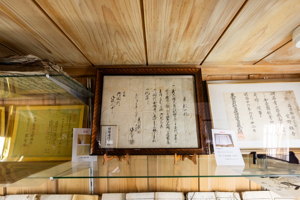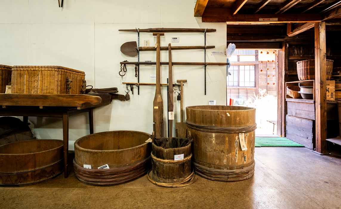門に隣接する民具展示室には、江戸時代から宮野家で代々受け継がれ、実際に使われてきた200点以上もの生活用具が展示されています。