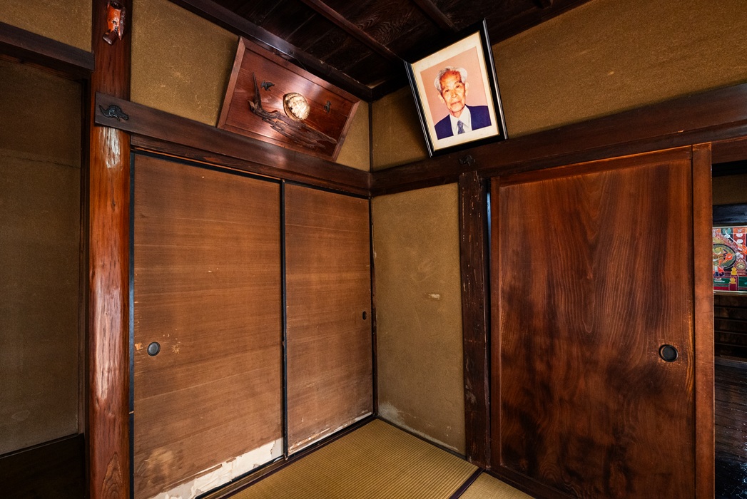 書院造りの床の間を備えた、背筋がピンとなる空間です。先ほどの居間との境目には4枚の帯戸がはめられていますが、よく見るといずれも同じ木目を持ち、同じ木から作られたものだとわかります。主張は控えめながら、細部にまで行き届いた美意識。宮野家の豊かで美しい暮らしぶりを感じさせます。