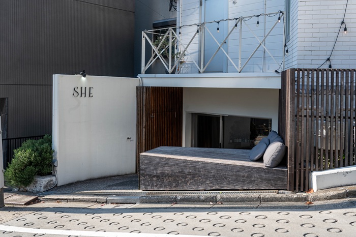 さて、この下り坂の途中にさりげなく佇んでいるのが、隠れ家風のカフェ「SHE meguro(シー メグロ)」です。