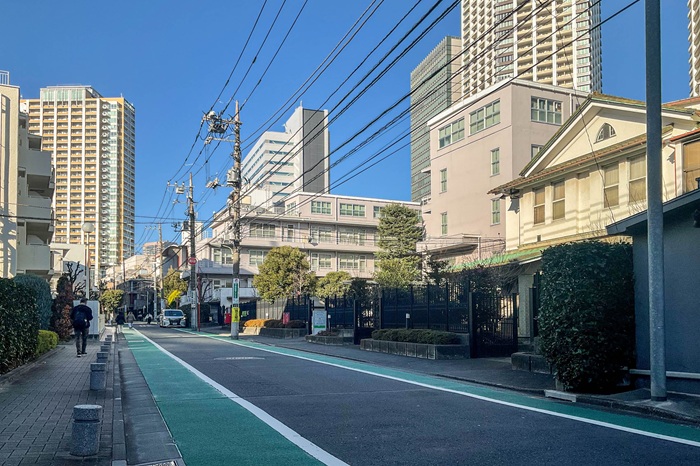 急勾配の行人坂とは対照的に、街路樹とシックな建物が穏やかな表情を見せるこの通り。その名は「ドレメ」と親しまれている服飾専門学校「ドレスメーカー学院」(学校法人 杉野学園)に由来します。