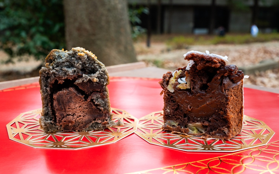 「ごまだんご」(350円)は、香ばしい黒ごま風味の生地のなかに、お団子がドンと鎮座。