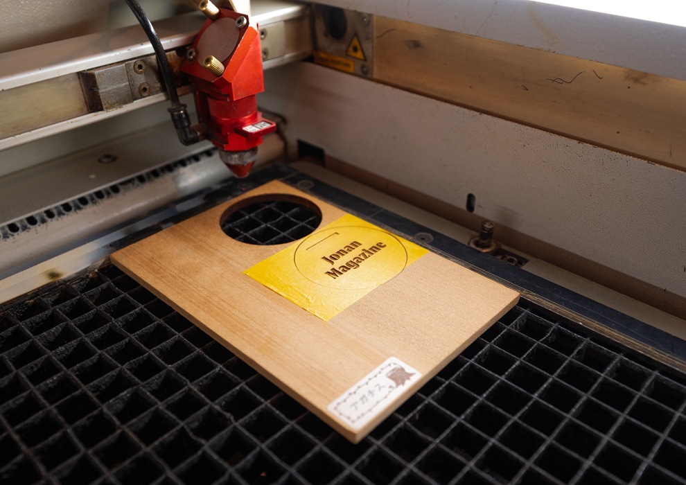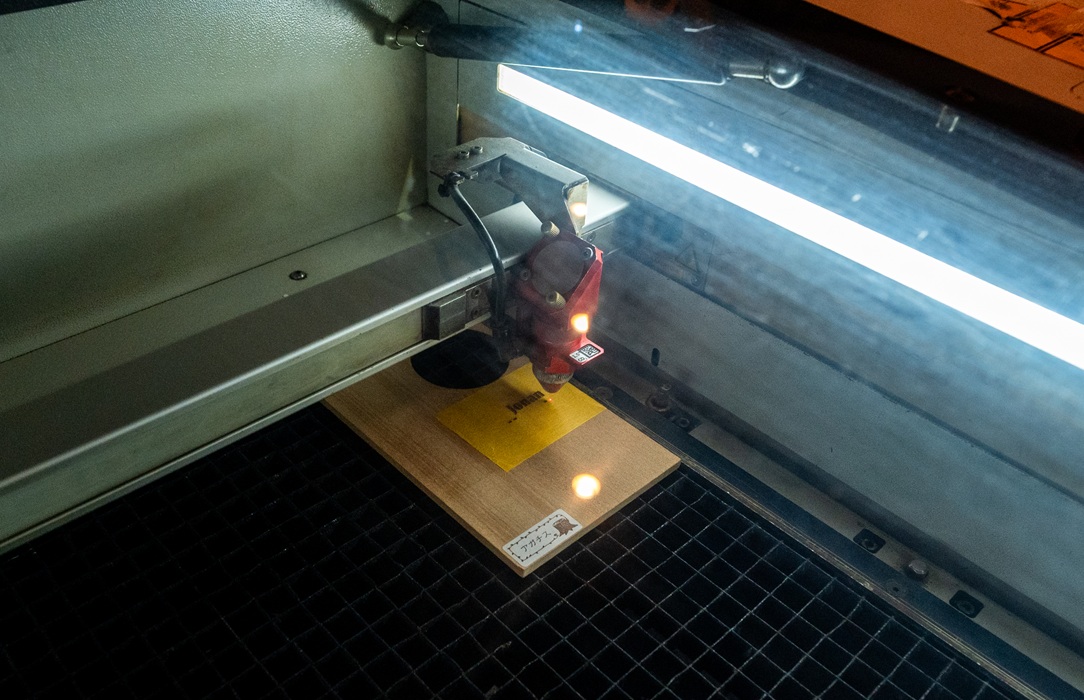PCのデータが現実のカタチあるものへと変わる瞬間。レーザーカットの作業時間は約2分で、あっという間に完了しますが、カッティングされる様子が面白くて、目が離せません。