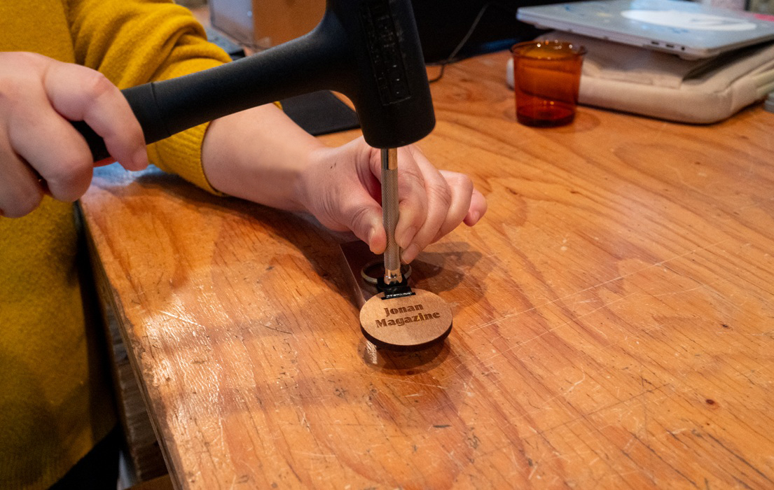 マスキングテープを丁寧にはがし、ベルトにカシメ(金具)を取り付ければ、世界にひとつだけのキーリングが完成!