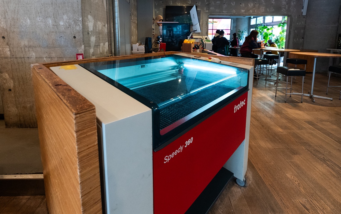 お店の大きな特徴は、カフェとファブリケーションスペースが地続きになっている点です。店内にはレーザーカッターをはじめとする、ものづくりのためのデジタル機器が設置され、専門的な知識がなくても、スタッフのサポートを受けながら制作体験できます。