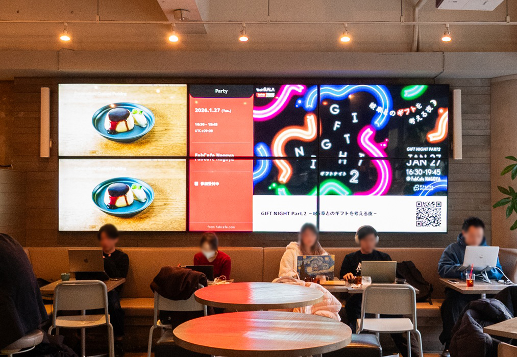 カフェ奥の大スクリーンには開催中や開催予定のイベントのイメージが次々と映し出される。好みのイベントを見つけよう