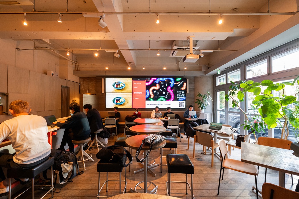 店内に足を踏み入れると、多くの人々がひしめき合い、心地よい熱気がみなぎっています。デザイナーやエンジニア、学生、フリーランスと思しき人たちが肩を並べ、画面と向き合い、キーボードを叩き、アイデアを形にする時間。ここが単なるカフェやワークスペースではなく「ものづくりの場」を前提に設計された場所であることが、醸し出す空気感から自然と伝わってきます。