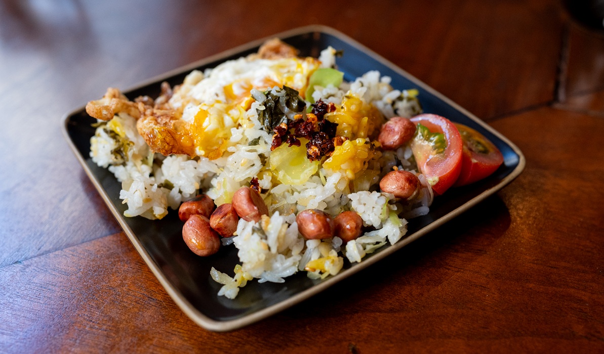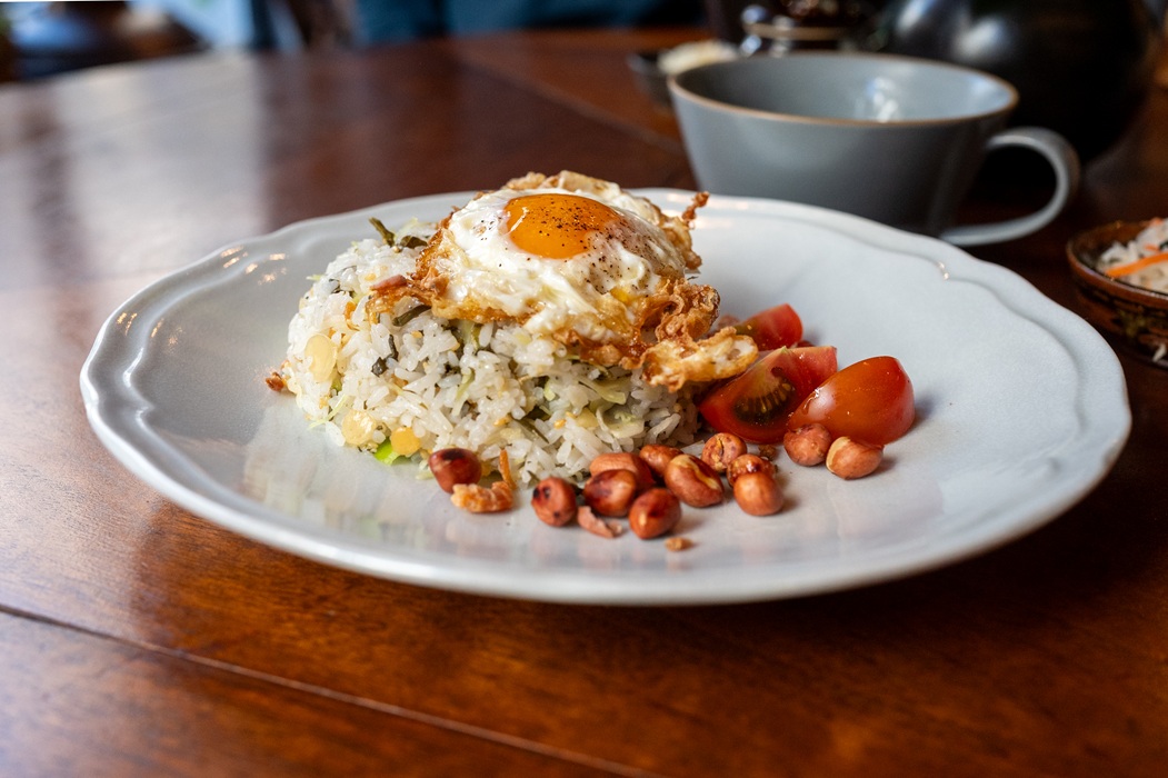 お米をベースに発酵させた茶葉、ひよこ豆やキャベツ、ナッツなどが混ざり合い、口に運ぶと、ほのかな酸味、旨み、香ばしさが次々とあらわれ、食感のリズムが楽しいのです。