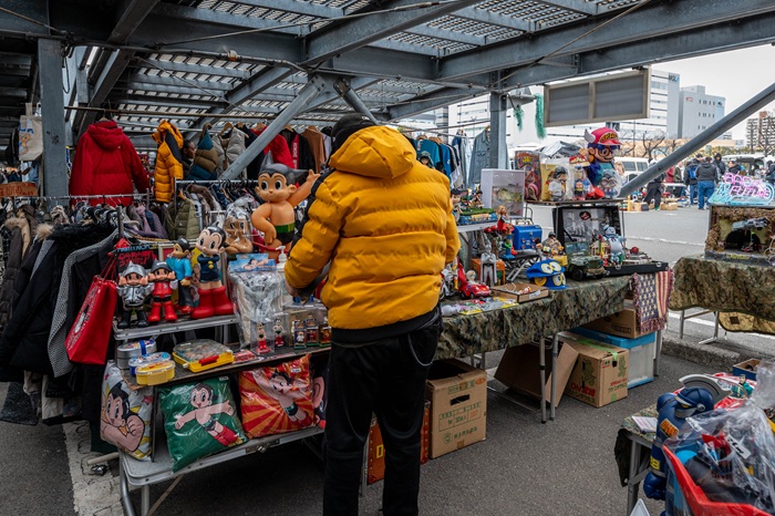 この規模だけでも圧倒されますが、さらに驚かされるのは、その約半数を外国人が占めているという点です。英語をはじめ、中国語や韓国語、東南アジアの言語、さらには中東圏の言葉までが飛び交い、アジア最大級といわれるタイ・バンコクの「チャトゥチャック・ウィークエンド・マーケット」を彷彿させるカオスな熱量が渦巻いています。トーキョー観光の途中に立ち寄る人もいれば、このフリマを目的に訪れるリピーターもいるそうで、その求心力の強さがうかがえます。