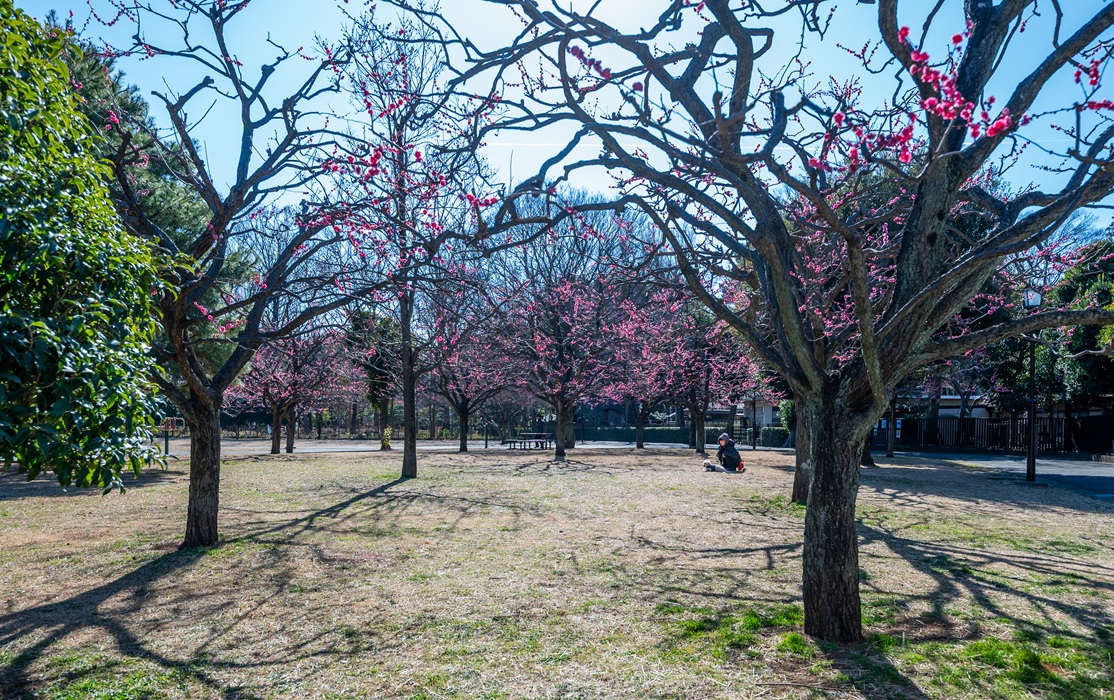 この日は冬枯れした樹木が凛と林立するなか、梅の花がほぼ満開。冷たい空気の中に春の気配を運んでいました。