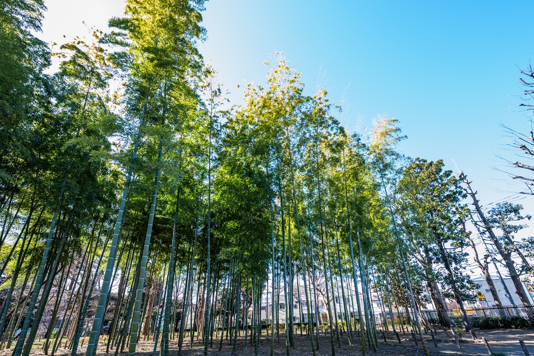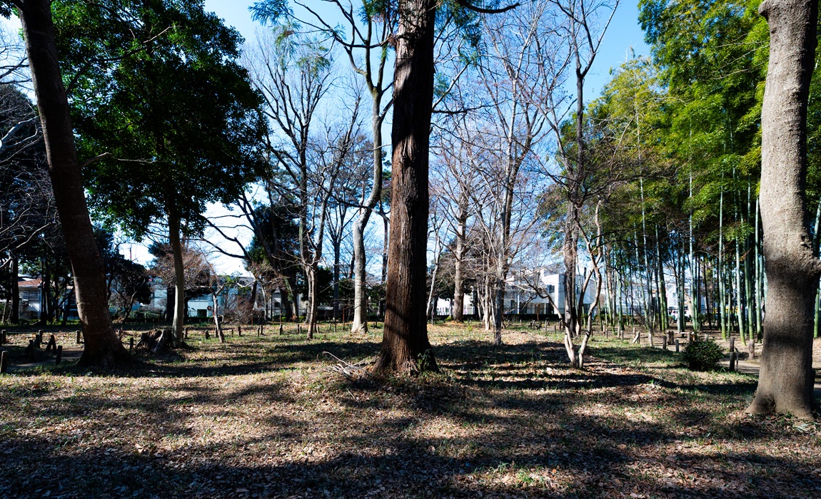 園内を歩けば、泰山木の大きな葉、空を突くように伸びるヒマラヤ杉や熊笹、そして幹がスッとまっすぐに伸びるスギ科のコウヨウザンなど、多種多様な樹木が目を楽しませてくれます。それは派手さのある庭園の対極にある、武蔵野の面影を色濃く残す「林」の中を歩く感覚。