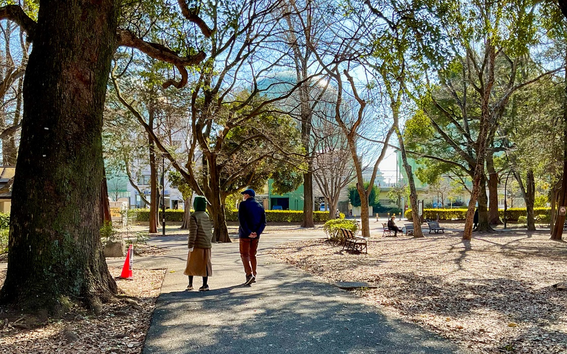 恒春園区域から一段低くなったエリアには子どもたちの声が響く児童公園があり、点在するベンチでは人々が思い思いの時間を過ごしています。