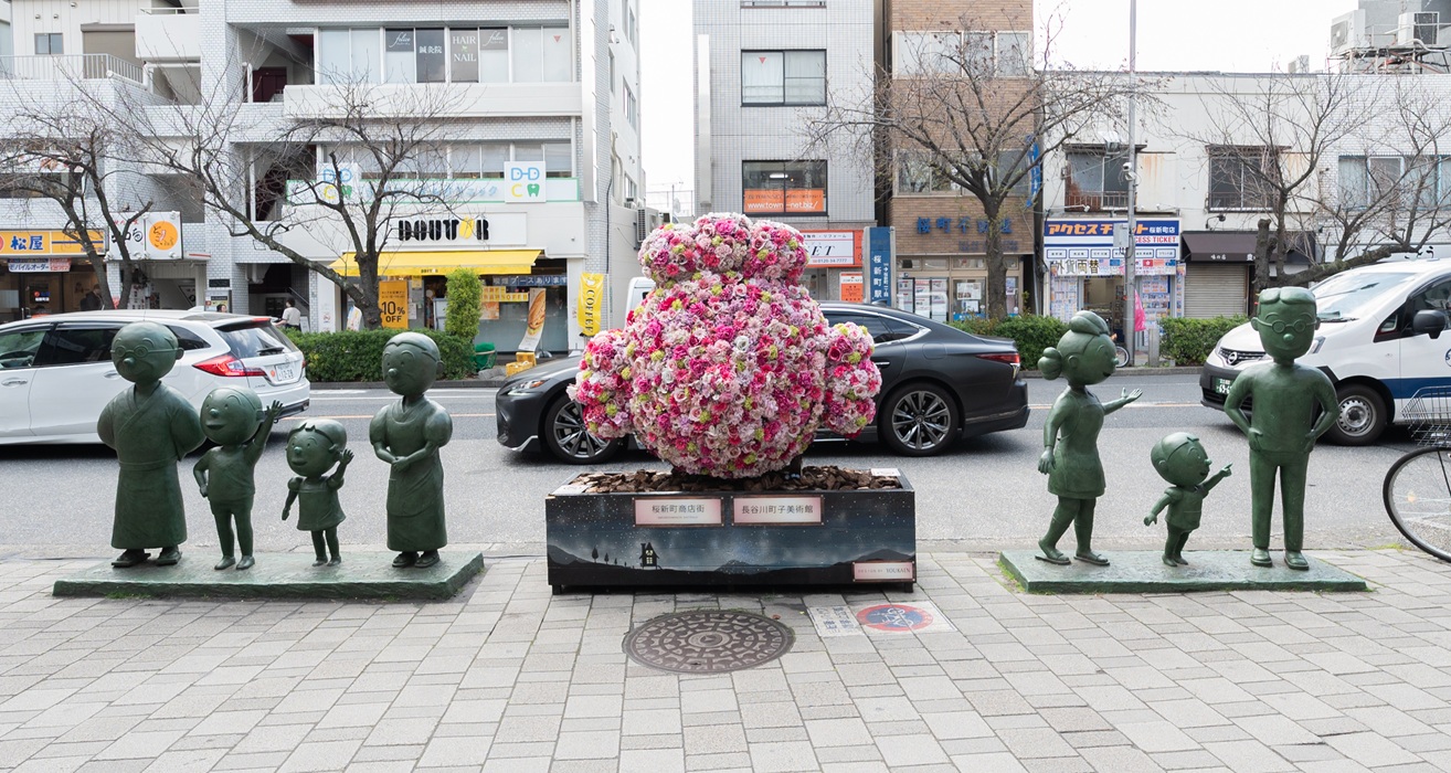 東急田園都市線の桜新町駅の地上出口を上がると、やわらかな春の光に包まれた桜の隣で、アノ懐かしい顔ぶれが出迎えてくれます。波平、フネ、サザエ、マスオ、タラオ、カツオ、ワカメ…磯野家とフグ田家の面々。思わず「久しぶり」と言いたくなるような親近感に包まれます。