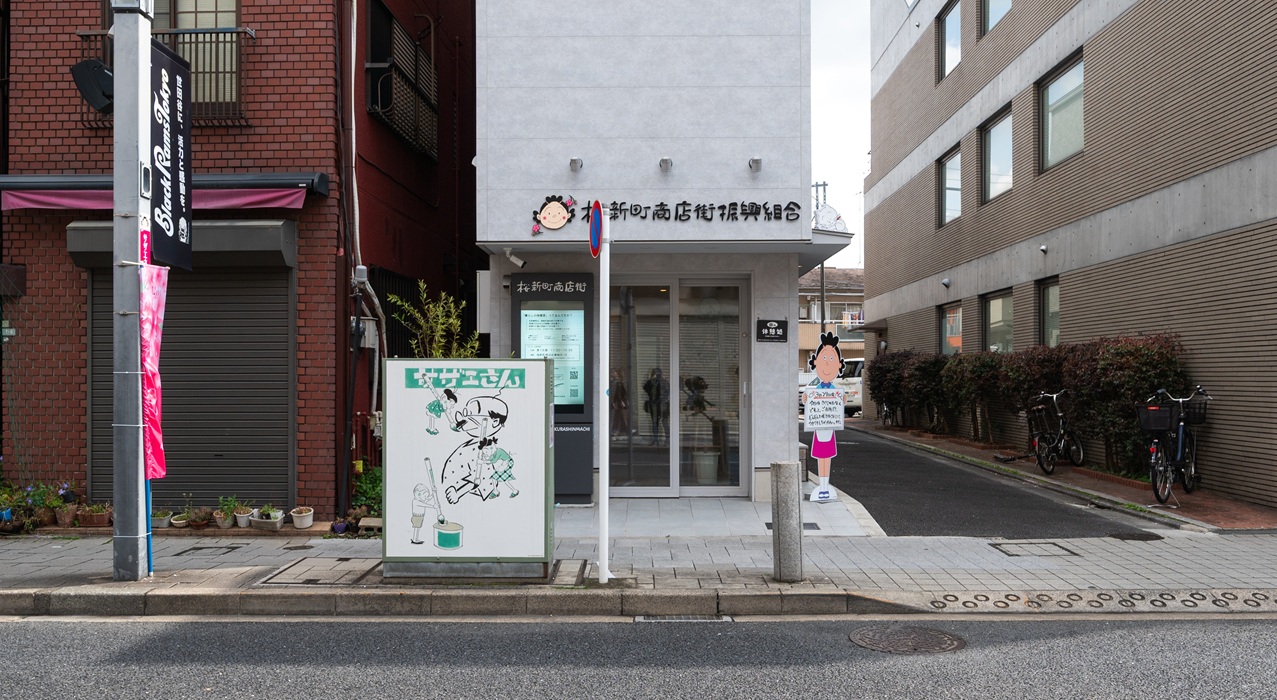 「サザエさん通り」と名付けられた商店街を歩き始めると、建物の外壁や郵便ポスト、通りを飾るフラッグなどにサザエさんファミリーを目にすることになります。