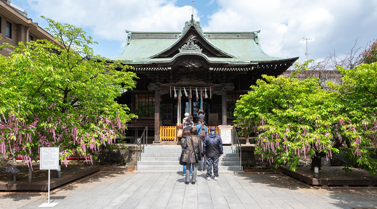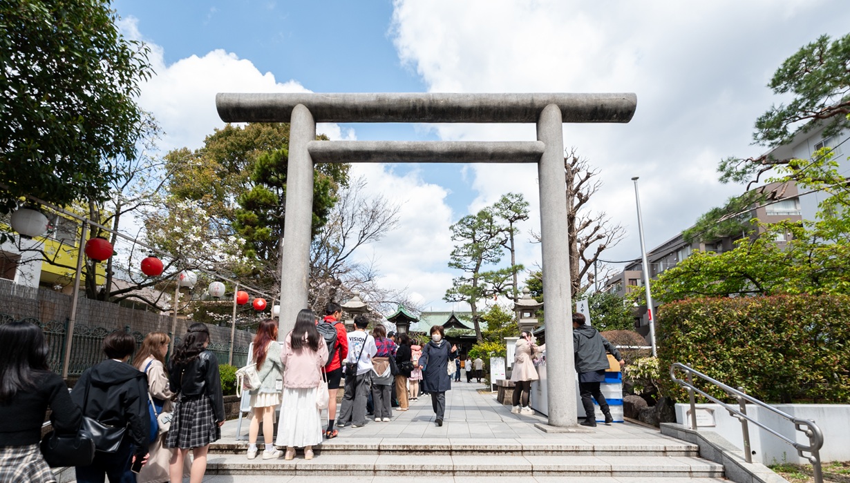 桜が連なる駅前通りは、江戸時代に大山詣での旅人たちが行き交った「大山街道」でした。そんな歴史の面影を伝承するように地元の人はここを「旧道」と呼びます(ちなみに、並走する国道246号は「新道」)。春になれば桜のトンネルとなるこの通りを駒沢方面に進むと、驚くような長い行列が目に入ります。「桜神宮」の御朱印を求める人たちです。毎月限定の御朱印はとりわけ人気が高く、御朱印帳を手にした人々が、静かな高揚感とともに順番を待っていました。